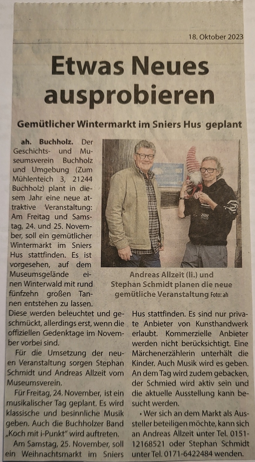 – Ankündigung für den 24. November 2023– Weihnachtsmarkt im Sniers Hus